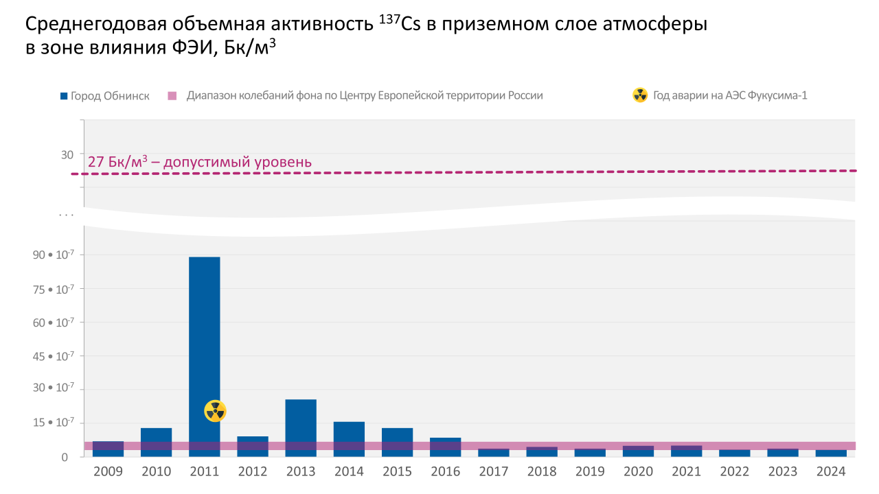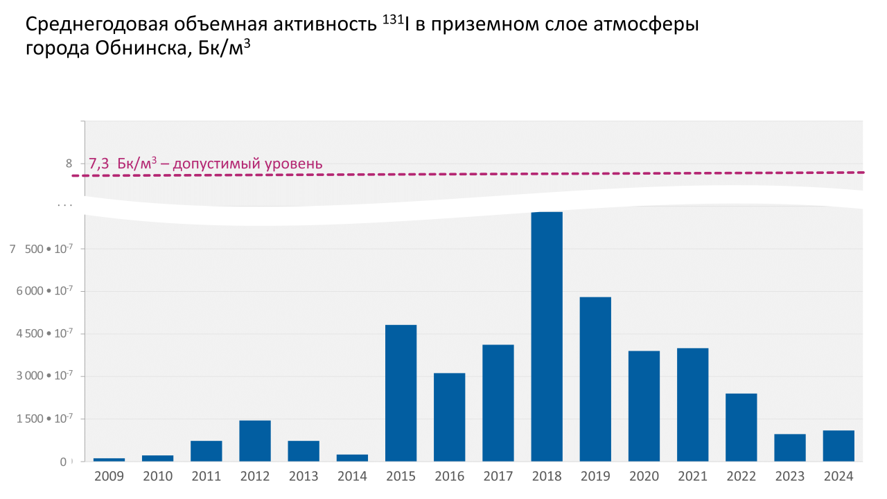 По данным НПО «Тайфун» в 2016-2024 гг., как и ранее, в приземном слое атмосферы в центре города Обнинска среднегодовая объемная суммы бета активных радионуклидов была несколько выше средневзвешенных показателей по Центру Европейской части России, но оставалась на 3-4 математических порядка ниже допустимого значения по НРБ−99/2009. Из техногенных радионуклидов высокочувствительными приборами регулярно регистрировались 137Cs, 90Sr, и радиойода 131I. Регистрация радиоактивного йода связана с деятельностью филиала НИФХИ.