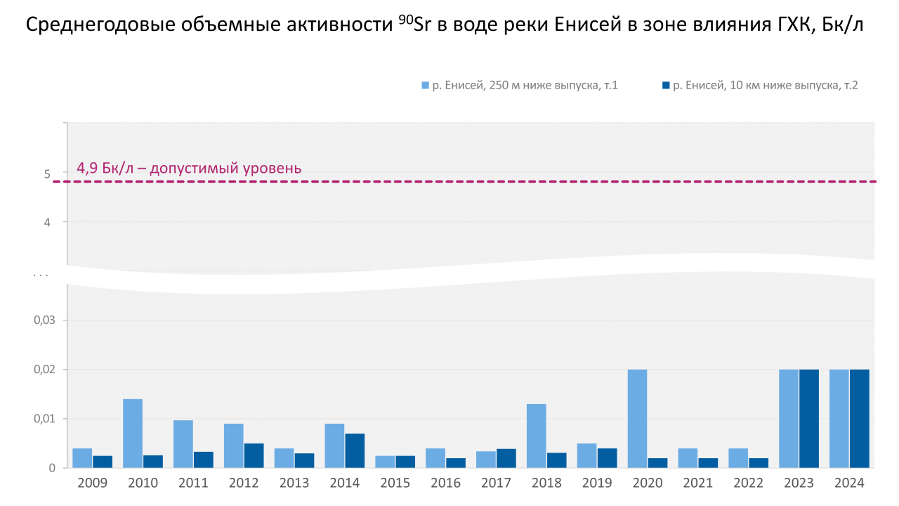 Содержание радионуклидов в воде р. Енисей контролируется ежегодно в двух контрольных створах у правого берега в 250 м и в 10 км ниже выпуска сбросных вод комбината (на 1 км выше первого населённого пункта по правому берегу с. Большой Балчуг). Основной вклад в объёмную активность воды вносит 90Sr, по данным радиоэкологического центра ГХК его концентрации в период 2015-2023 гг., как и ранее, были на два-четыре порядка ниже допустимого уровня вмешательства по НРБ-99/2009. Исследования проб воды в тех населённых пунктах, где возможно обнаружение радионуклидов техногенного характера, (в р. Енисей в с. Большой Балчуг и с. Атаманово, в р. Большая Тель возле с. Большой Балчуг) не выявили их присутствия.