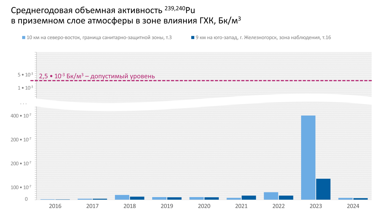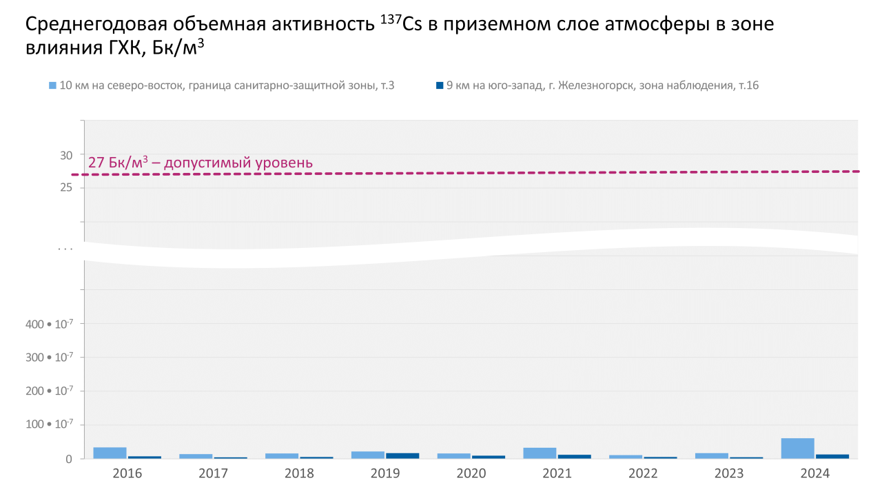 В 2019-2024 гг. в санитарно-защитной зоне и зоне наблюдения ГХК интегральные показатели загрязнения почвы цезием (137Cs дает основной вклад) превышали показатели в контрольном пункте на 20-30%, но оставались на три порядка ниже уровня, обеспечивающего экологическую и радиационную безопасность наземной среды. Интегральный показатель загрязнения водных объектов в зоне влияния ГХК был на три-четыре порядка ниже экологически безопасного уровня риска.