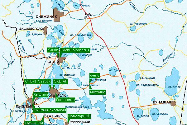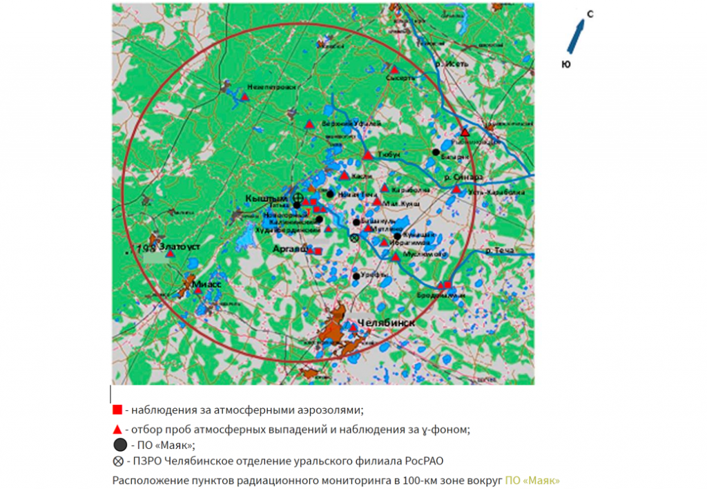 Расположение пунктов радиационного мониторинга в 100-км зоне вокруг ПО «Маяк»