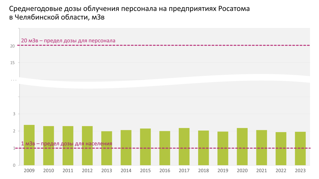 В 2016–2023 гг. как и ранее среднегодовые дозы облучения персонала группы «А» на предприятиях Госкорпорации "Росатом" в Челябинской области колебались в пределах 2,0 – 2,4 мЗв и не превышали 12 % от санитарного норматива для персонала, который составляет 20 мЗв в год.