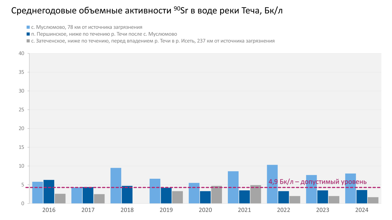 Самые высокие среднегодовые объёмные активности 90Sr в воде р. Течи в период с 1994 г. по настоящее время, по данным Уральского УГМС, наблюдались в с. Муслюмово. После 2012 года показатели загрязнения воды в с. Муслюмово постепенно снижаются. В пунктах наблюдения ниже по течению в последние пять лет они не превышают уровня вмешательства.