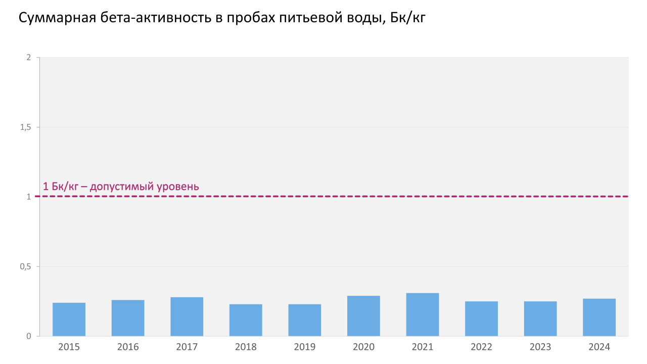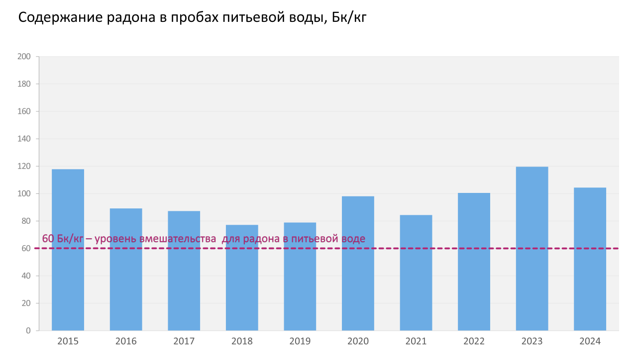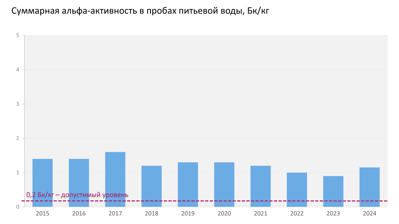 В пробах питьевой воды измеренные значения суммарной активности U238 не превышали уровня вмешательства 3,0 Бк/кг. В то же время суммарная альфа-активность и содержание радона в питьевой воде в несколько раз превышают установленные нормативы.
