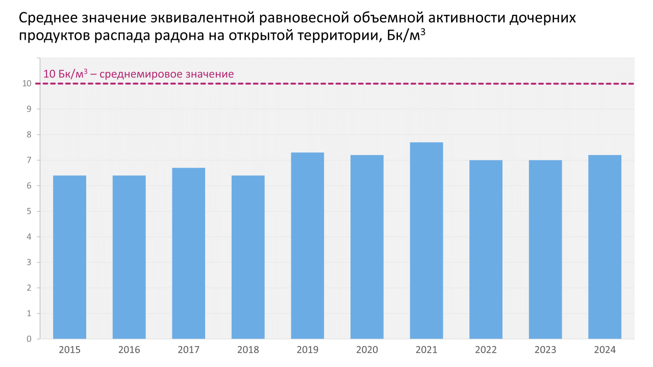В период 2015-2024 гг. в Краснокаменске среднее значение эквивалентной равновесной объемной активности (ЭРОА) изотопов радона на открытой территории, как и ранее не превышало среднемировой показатель ~10 Бк/м3.
